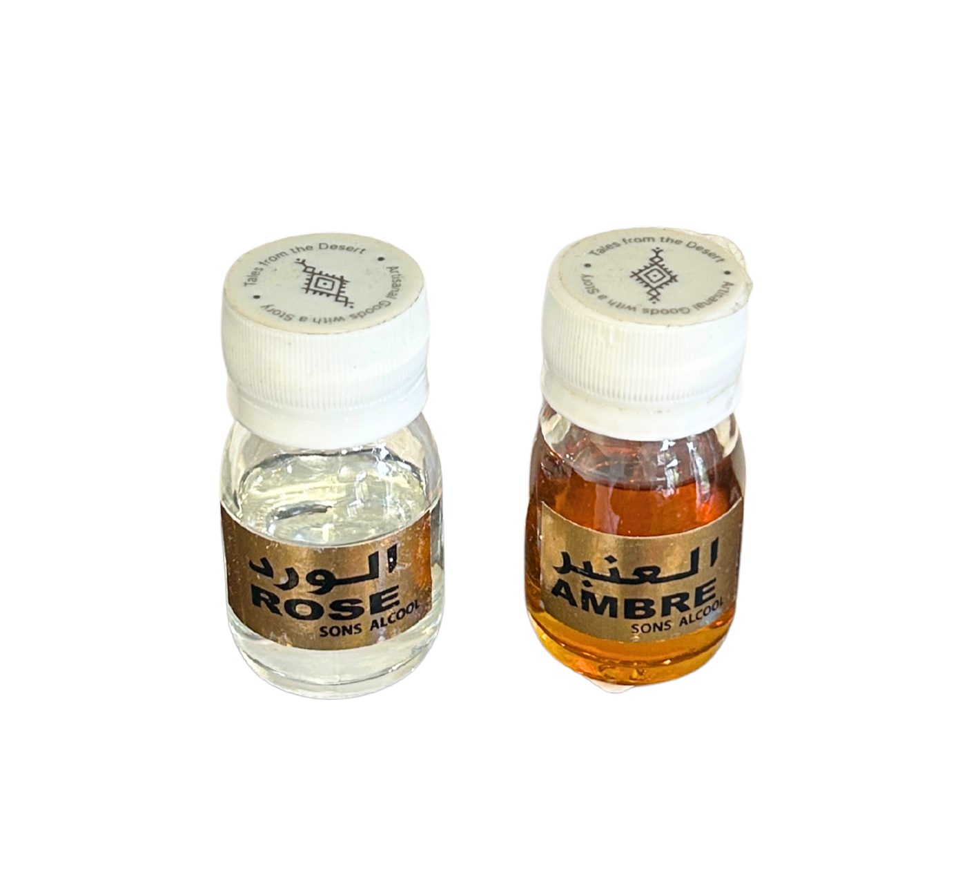 de Originele Amber en Roos (alcoholvrij) uit Marokko. Iedereen die in Marrakech is geweest herkent deze geuren. Om te branden in een houder met waxinelichtje.